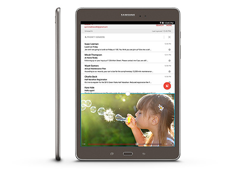 Make the most out of your tablet time with advanced multitasking tools. Easily open two apps side by side so you can flip through your photos while browsing online. Check social media and your social calendar at the same time. With Multi Window on the Galaxy Tab A, you can do more, faster.